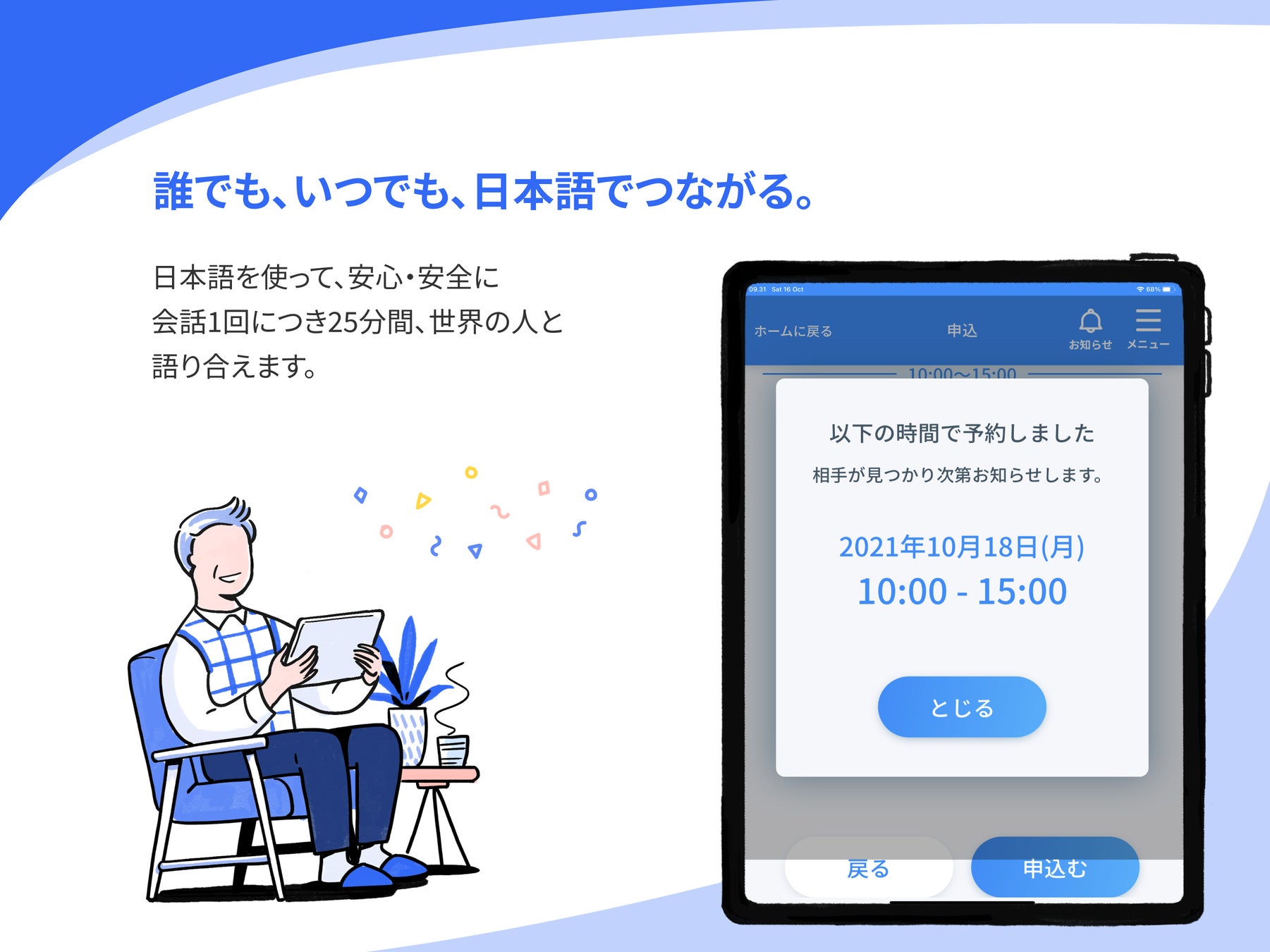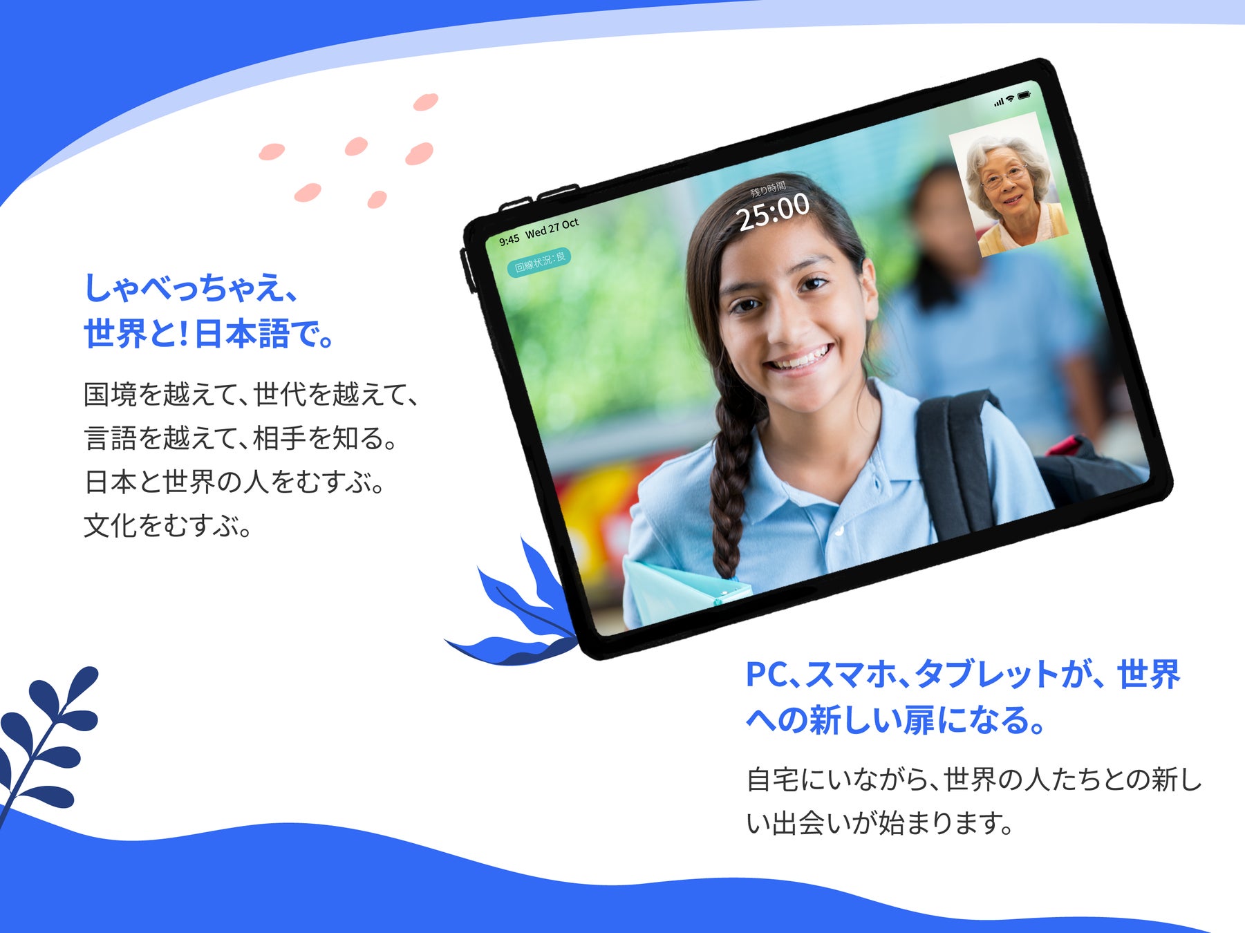 日本の人と日本ファンの世界の人を"日本語"で繋ぐ「日本語でのグローバル・コミュニケーション・サービス」です。予約、会話、評価、分析まで一気通貫で行い、日本の高齢化問題、外国人の教育や文化理解の課題をワンストップで解決。